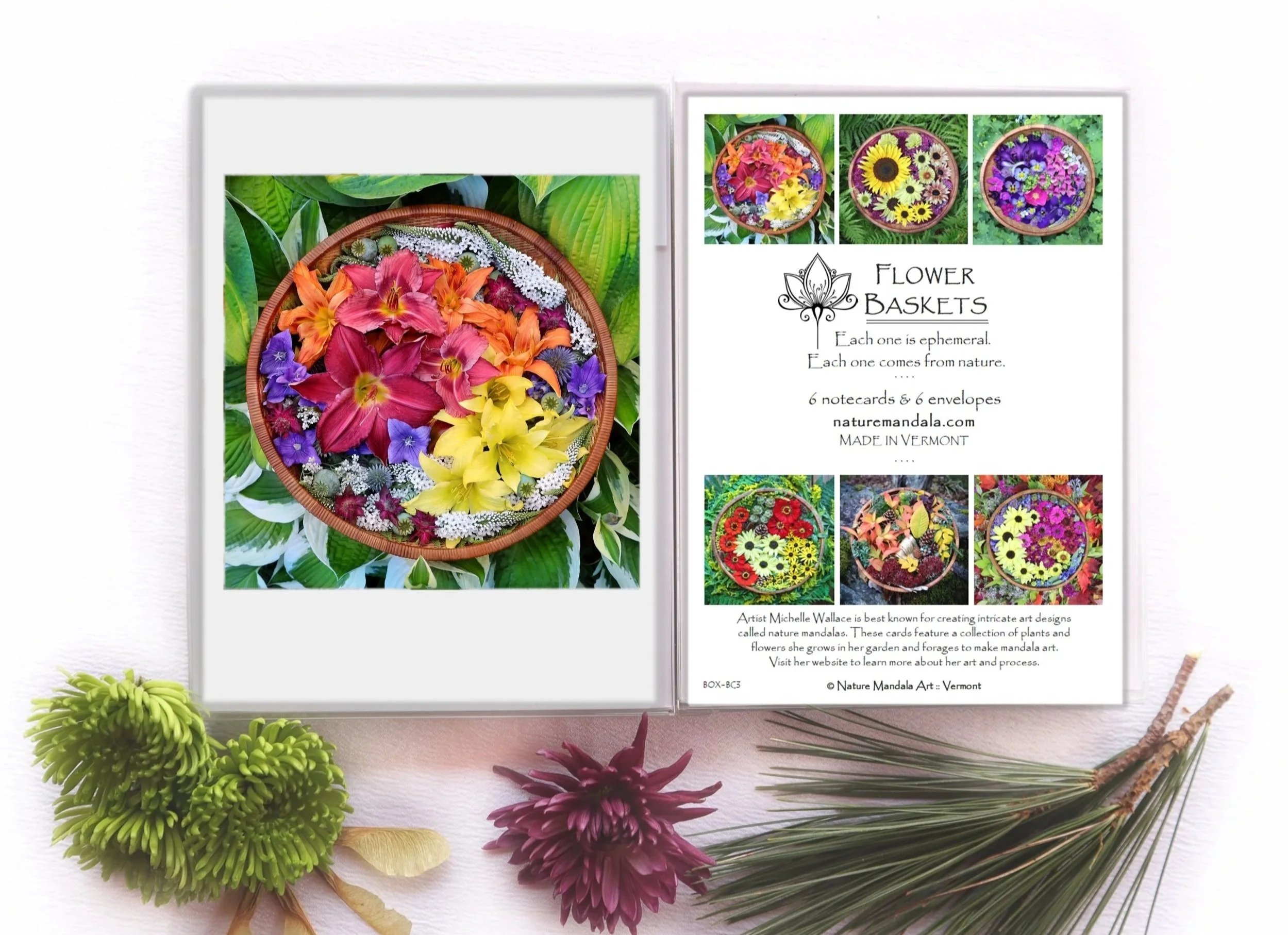 This special collection of flower baskets features some of the beautiful plants and flowers the artist grows in her garden and forages to make mandala art.